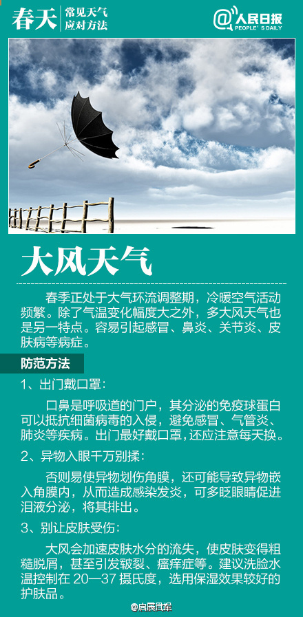 如何應對初春多變天氣作者:合眾電氣發布時間:2016-03-23瀏覽量:11215 次字體顯示:【大】【中】【小】 春季天氣調皮,昨天還日光融融閑賞花,今日就寒風瑟瑟緊添衣!大風、沙塵、陰雨等交替上演,讓感冒、過敏、關節炎等進入高發期。今天#世界氣象日#,四張圖教你應對春季多變天氣! 上一篇: HZXC-104D變壓器智能控制箱最新發貨現場下一篇: 面對問題疫苗,我們怎么辦?