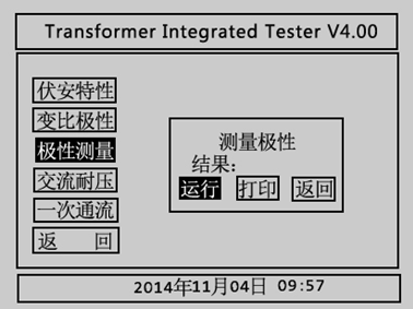 在CT測試主界面中光標選擇極性測量選項,點擊旋轉鼠標進入CT極性測量界面如圖3.22所示。CT極性試驗接線與CT變比極性試驗接線方式相同,按下互感器綜合特性測試儀運行后,儀器會自動檢測所連接CT的極性。選擇打印選項則將試驗結果打印,選擇返回選項則返回至CT試驗主界面。